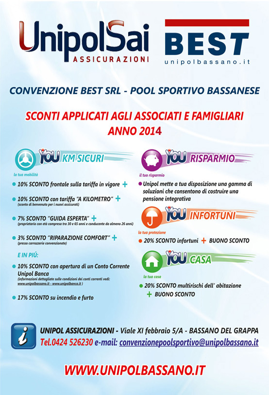 Trasparenza, serietà, attenzione alle esigenze assicurative di chi pratica lo sport, in particolare verso i giovani ed alle altre necessità assicurative e previdenziali delle loro famiglie. Siamo partner del POOL SPORTIVO BASSANESE che riunisce importanti discipline sportive quali Basket, Calcio, Hockey su pista, Pallavolo, Rugby, Tennis, Volley e che annovera importanti Società che militano nei campionati nazionali e regionali. La Convenzione prevede sconti per gli atleti e loro familiari conviventi nelle polizze Rc Auto (autovetture e autoveicoli ad uso privato e promiscuo), Auto rischi diversi, Infortuni e salute, Multirischi abitazione. L'Agenzia UNIPOL - BEST SRL mette a disposizione personale dedicato per seguire i Clienti che aderiscono alla convenzione in oggetto. E' stata attivata anche una casella di posta elettronicadi servizio per gli associati:
